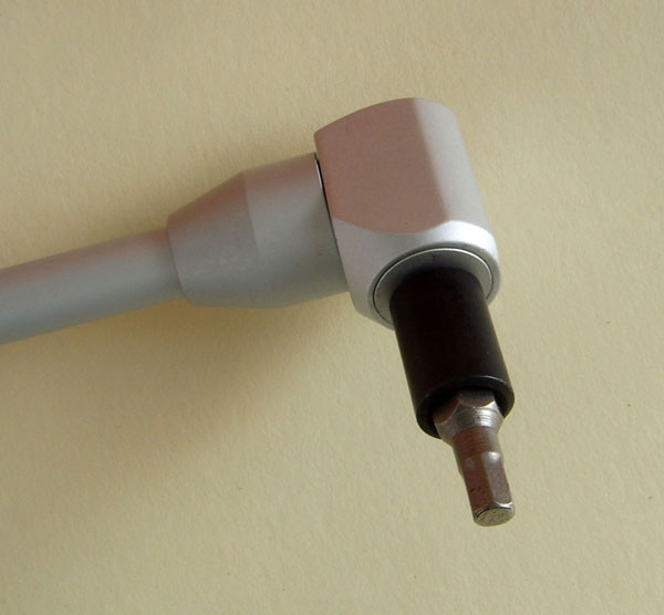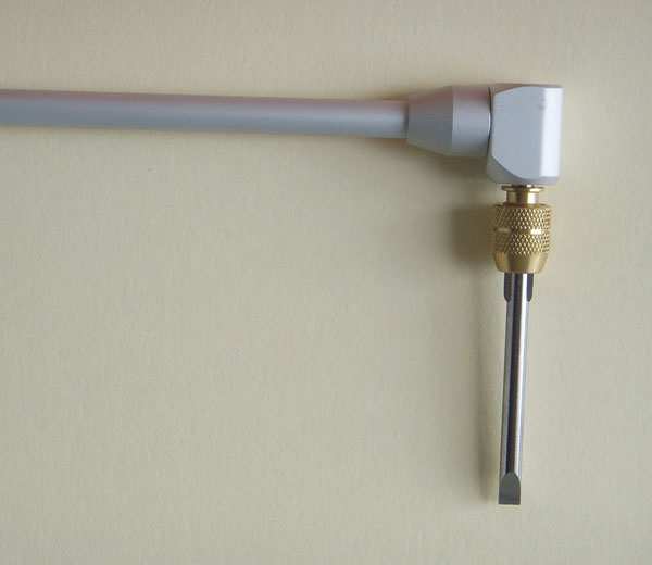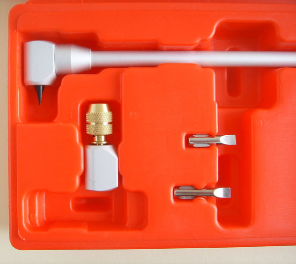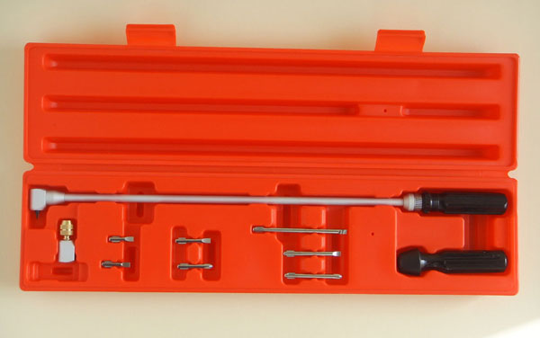 |  Professional 90 degree screwdriver. 480mm long (19inches) approx. Comes in a quality heavy moulded plastic box.  Very short slot bit as standard. Seven alternativelength bits (5 x slot, 2 x star) fit in second bevel drive head.  Side fixing steadying handle fits on the shaft inany place and at any rotated angle as below  Bevel drive and the 2 standard heads. They just screw onto the bevel drive. The slot head needs only 32mm clearance. On the 2nd head the bits are held by the brass knurled attachment.  Second head attached with longer slot bit attached  Optional 3rd bevel head. £12 extra on shopping cart and £9 if bought with Bevel Screwdriver. This is a standard hex bit holder that will hold any bit that fits a power screwdriver, slot, philips, pozi, allen, torx etc.  The £9 optional 3rd bevel head with an allen bit attached.  Detail of bevel drive and head.  | The Bevel 90Carburettor Pilot Adjustment Tool - Makes pilot Adjustment Easy! Bevel 90 is a professional quality tool at asensible price. Perfect for those impossible to reach idle mixture screws and at afractionof the price of OE tools. Features Include: Bevel gearbox drive with zero free play ensuresaccurate adjustment. Standard slot screwdriver for veryinaccessible screws. Only 32mm clearance needed. Seven extra bits (5 x slot, 2 x star) fitin alternative bevel head drive. Different length slot and phillips bits for more or less accessiblepilot screws. Side grip handle fits any position on the shaft and can be rotated toany angle for easy steadying of the screwdriver. £5 optional 3rd hex drive bevel head. Works with standard power screwdriver bits, slot, philips, pozi, allen, torx etc. (On 91-03 Honda 750 Nighhawks there's an oil supply pipe directly underthe head of the #2 pilot screw. This obstructs access to this screw.) £47 for this professional tool. £12 for optional hex drive head. £9 when bought with the bevel screwdriver. |