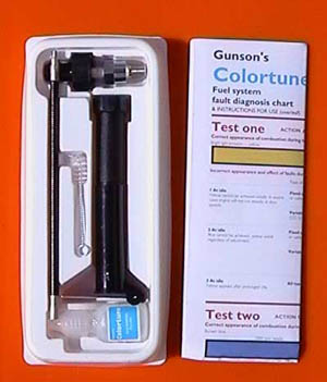 What is the Colortune? The Colortune has a clear spark plug that lets you look into the combustion chamber while the engine is firing. The colour of the combustion flame tells you if the mixture is correct. With the carburettor mixture screw you can then adjust the flame colour to get the correct mixture. The Colortune has colour charts and comprehensive instructions to carry out the job effectively. An effective flame colour - diagnosis section is included in the booklet. Comes complete with periscope for recessed plugs. Take the guesswork out of engine tuning with the Colortune. The world famous glass topped spark plug that gives you a window into the combustion chamber so you can see the flame. Why is this important? The flame's colour tells you the richness of the air/fuel ratio. A yellow flame means a rich mixture and a blueish white flame a weaker mixture. Usually a bunsen blue flame is spot on. The Colortune is so simple that anyone can use it. It works on the principle that certain fuel mixtures burn with a certain color. The Colortune will work on both motorcycles and cars with carburettors. Just adjust the mixture screw to get the correct flame colour. Also works on injection systems that have a mixture adjuster. Mainly older injection systems. The Colortune comes in 3 spark plug thread sizes. 10mm, 12mm and 14mm. (Most cars are 14mm) What size are your spark plugs? For NGK the first letter on the spark plug number indicates the size. C 10mm D 12mm B 14mm Check the NGK code number for: motorcycles here marine engines here snowmobiles here When ordering state whether you want the 10mm, 12mm or 14mm kit. Only £40 Check what that is in your currency. |