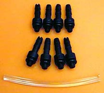 Contents This is what it looks like when you open the box. On the left the Carbtune and rubber hoses. On the right the plastic cable clip to hang gauges from the handlebars and inside the small plastic bag there are 4 x 5mm adapters, 4 x 6mm adapters and one fine bore thick wall clear plastic tube about 8cm (3”) long by 5mm (0.2”) diameter to make the restricters. If ordered with the Toolpouch then the same contents will be packed inside the Toolpouch. |